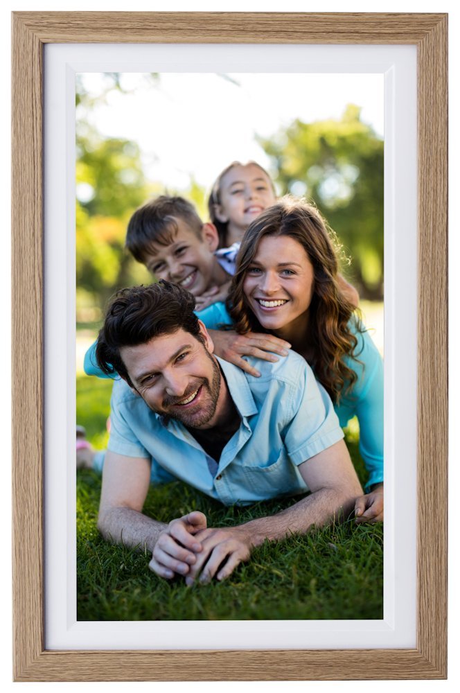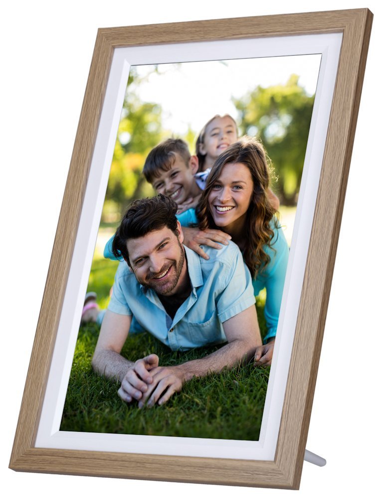 Moderní digitální fotorámeček s 15,6" Full HD IPS displejem a elegantním designem v dřevěné optice dub s bílým paspartou. Díky Wi-Fi připojení a bezplatné Frameo aplikaci můžete snadno sdílet fotografie a videa přímo ze svého telefonu nebo tabletu s rodinou a přáteli po celém světě.