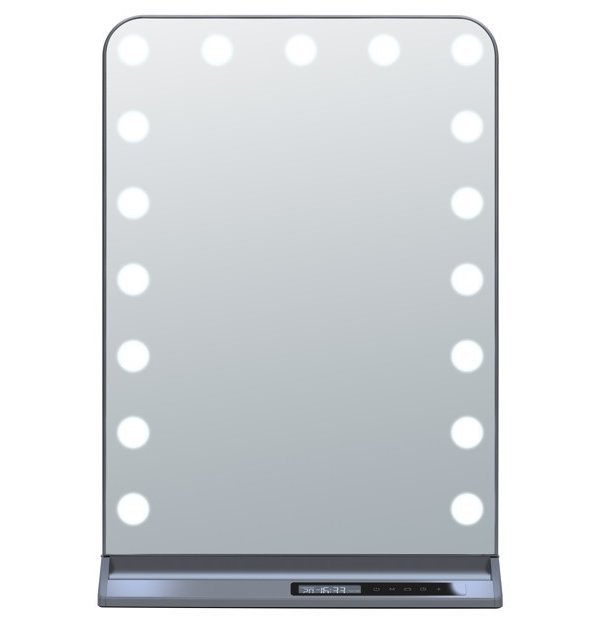 Zrcadlo, stolní, kosmetické, LED osvětlení, zvětšovací zrcátko, 3000/4200/6000K, 1400lm, displej, USB a USB-C výstup, šedé