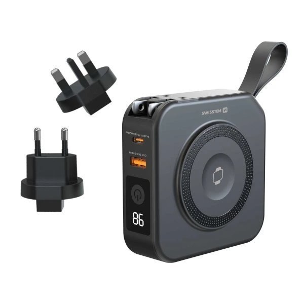 Powerbanka SWISSTEN All-in-one pro nabíjení zařízení kdykoli a kdekoli – doslova. Tento model disponuje vyměnitelnými vidlicemi, díky čemuž je použitelná po celém světě. Ve spojení s 20W nabíjením představuje univerzální řešení pro rychlé napájení na cestách i při každodenním použití. Zabudované nabíjecí konektory a bezdrátové MagSafe nabíjení podporují maximální pohodlí.