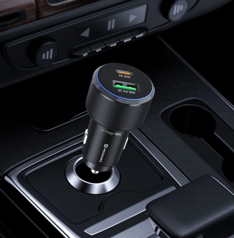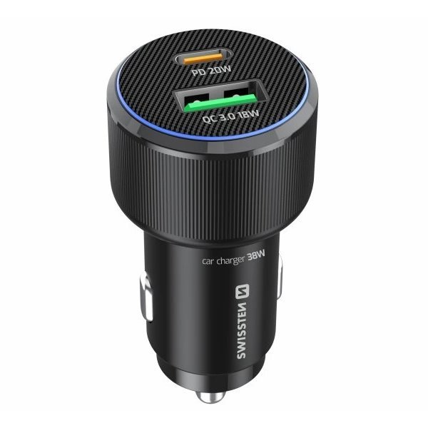 Výkonná autonabíječka SWISSTEN kombinuje dva nabíjecí porty – USB-C s Power Delivery 3.0 o maximálním výkonu 20 W a USB s Quick Charge 3.0 o výkonu 18 W. Díky celkovému výkonu 38 W dokáže efektivně nabíjet dva přístroje najednou bez ztráty rychlosti. Modré LED osvětlení v obvodu nabíječky usnadňuje připojení kabelu při jízdě v noci.