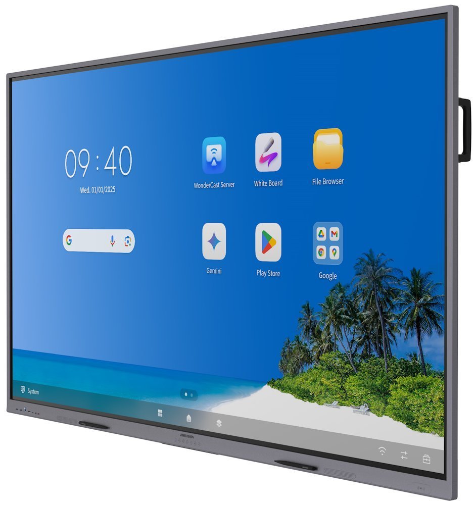 Interaktivní panel Hikvision DS-D5B86RB/EP kombinuje technologie dotykového ovládání, UHD zobrazení, zpracování videa, síťové komunikace a inteligentního řízení. Displej s úhlopříčkou 86" a rozlišením 4K UHD 3840 × 2160 px při 60 Hz využívá VA panel s jasem 400 cd/m² a kontrastem 5000 : 1. Povrchové sklo s tvrdostí 9H a 7 Mohs má antireflexní úpravu s 25% Haze pro optimální čitelnost při různém osvětlení.