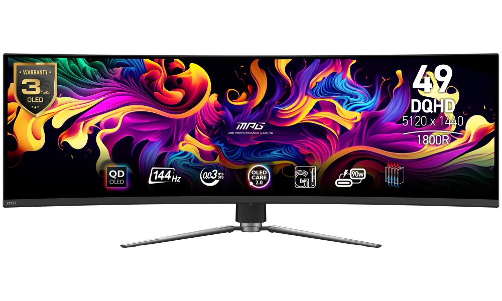 Monitor MSI MPG 491CQP kombinuje 49" QD-OLED panel s rozlišením 5120 × 1440 px (DQHD) a poměrem stran 32 : 9, který nahradí dva klasické monitory vedle sebe. Díky zakřivení 1800R dokonale obklopuje zorné pole a vytváří mimořádný zážitek při hraní i práci.