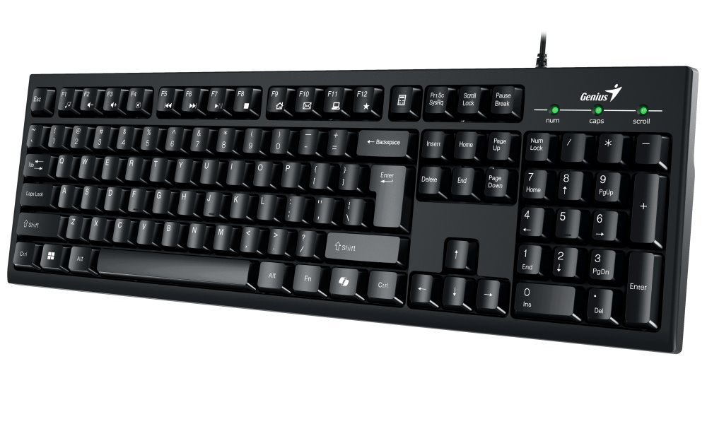 Drátová klávesnice s numerickou částí Genius Smart KB-100 pro pohodlné ovládání počítačových aplikací, psaní dokumentů nebo správu tabulek. Poslouží vám při každodenní práci v kanceláři i domácnosti. Mezi její přednosti patří podpora jedinečné aplikace SmartGenius, která vám umožní jednoduše naprogramovat nejrůznější klávesové zkratky a ještě více zefektivnit činnost na PC, ovládání multimédií nebo internetu. Díky voděodolné úpravě se nemusíte bát poškození v důsledku nechtěného polití. Pro připojení slouží standardní USB rozhraní a zařízení se uplatní jak jako hlavní klávesnice u počítače, tak také jako doplňková klávesnice k notebooku. Tento model je vybaven samostatnou klávesou Microsoft Copilot, která spustí nástroj umělé inteligence. Tato AI vám usnadní psaní e-mailů, bude vám asistovat při vyhledávání, přípravu konceptů, výtahů z webových stránek a dalších pracích s texty. Nástroj Microsoft Copilot je vhodný také pro chatování, kreativní psaní, kompozici a tvorbu napříč obory.